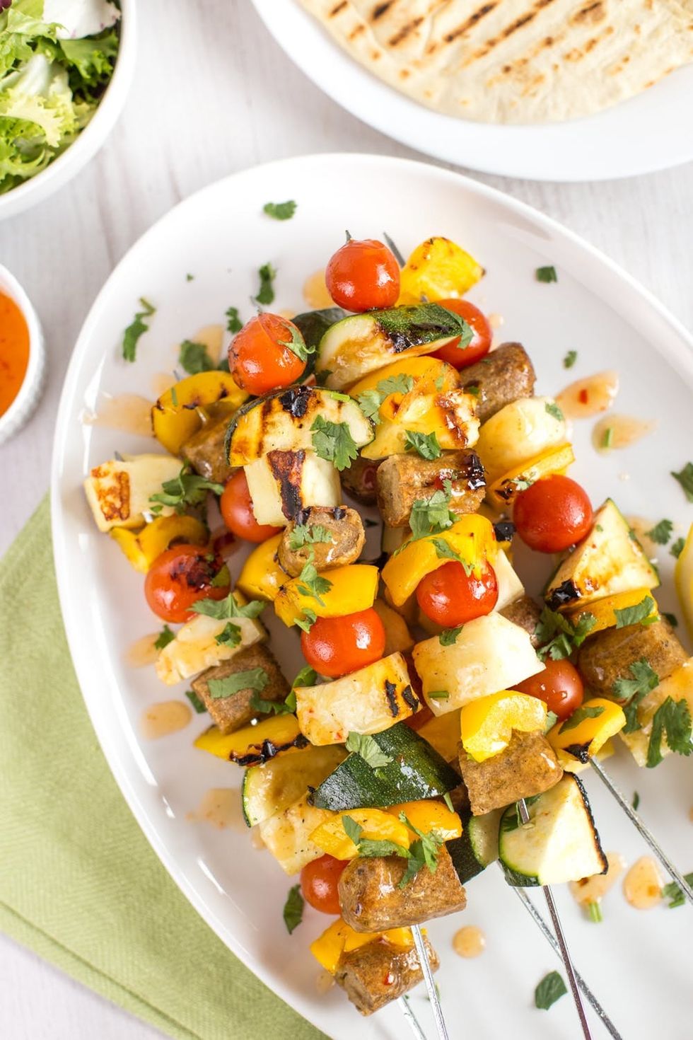 These halloumi skewers are so adaptable — feel free to use different veggies if you prefer. I like to use as many different colors as I can, to make them look as bright and vibrant as possible. I really loved using both halloumi and vegetarian sausages together (the only thing better than one yummy ingredient is two yummy ingredients, right?), but you can stick to just one kind of protein if you prefer.