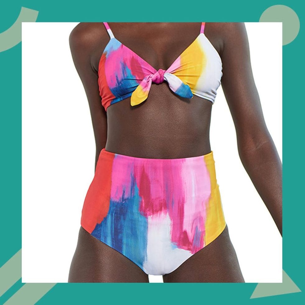 2. Retro and Ruffled: In addition to evergreen patterns, we’ll be seeing lots of retro cuts drawing inspiration from the Gidget era. Think high waists, front ties, and romantic, off-the-shoulder looks. “[Some other] standouts are crop tops, ruffle tops, smocking, rick-rack details, and wrap tops,” says Krock. Brit + Co Pick: Mara Hoffman Vestige Classic Bra Top ($150) + High Waist Bottom ($145).