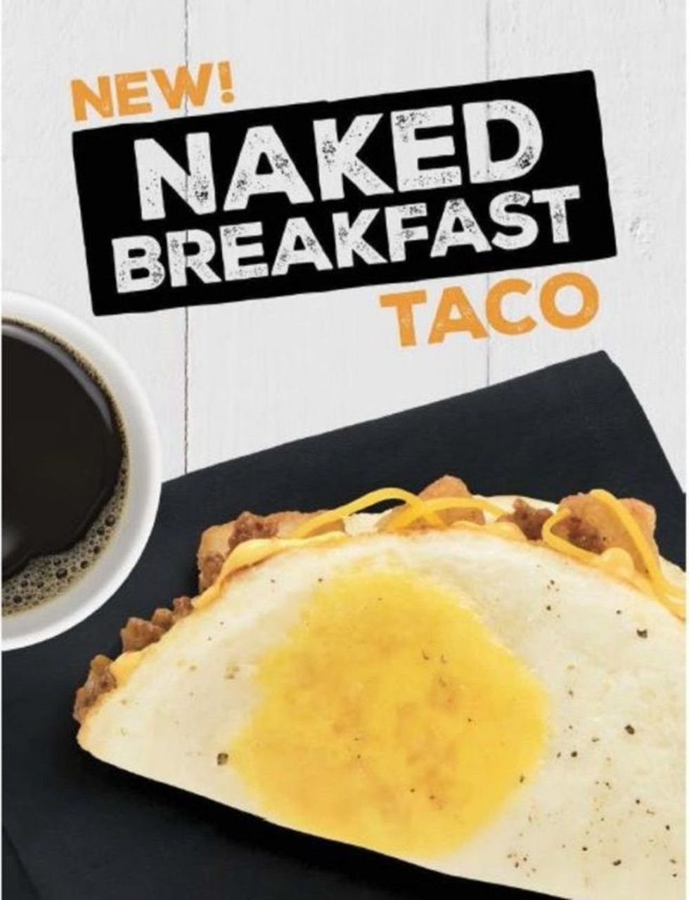 Introducing the naked breakfast taco: a complete breakfast with potato bites, sausage or bacon, nacho cheese, and shredded cheddar surrounded by a shell constructed with a fried egg, yolk and all. If you don’t like the idea of the egg shell, you can order the naked taco “dressed,” and it will come with a traditional taco shell.