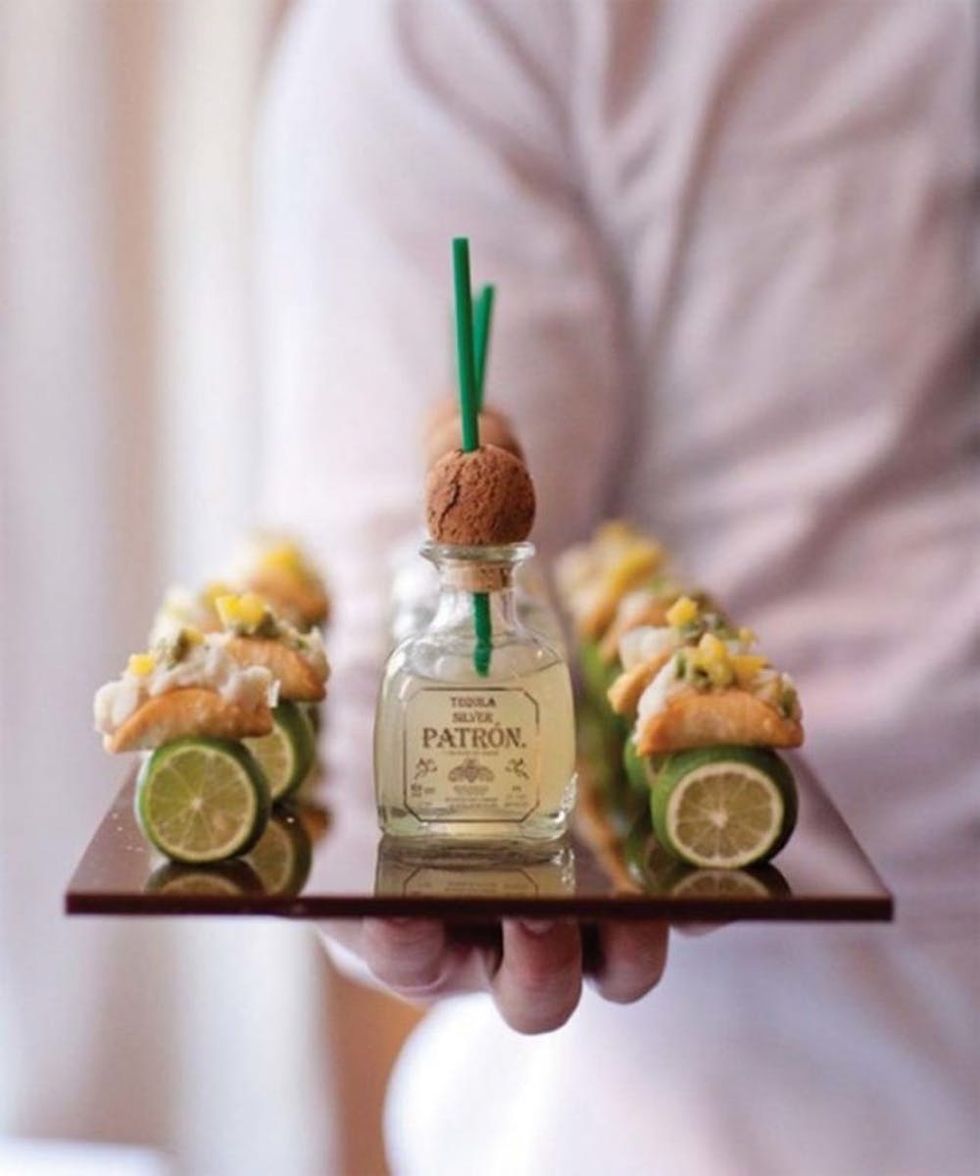 2. Taco Shooters:How cute are these tiny taco shooters? They sit atop a slice of fresh lime, and are accompanied by everyone’s favorite wedding drink: tequila. (via Style Me Pretty)