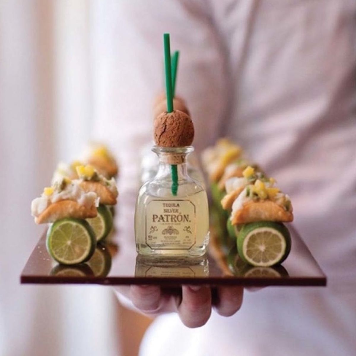 2. Taco Shooters:How cute are these tiny taco shooters? They sit atop a slice of fresh lime, and are accompanied by everyone’s favorite wedding drink: tequila. (via Style Me Pretty)