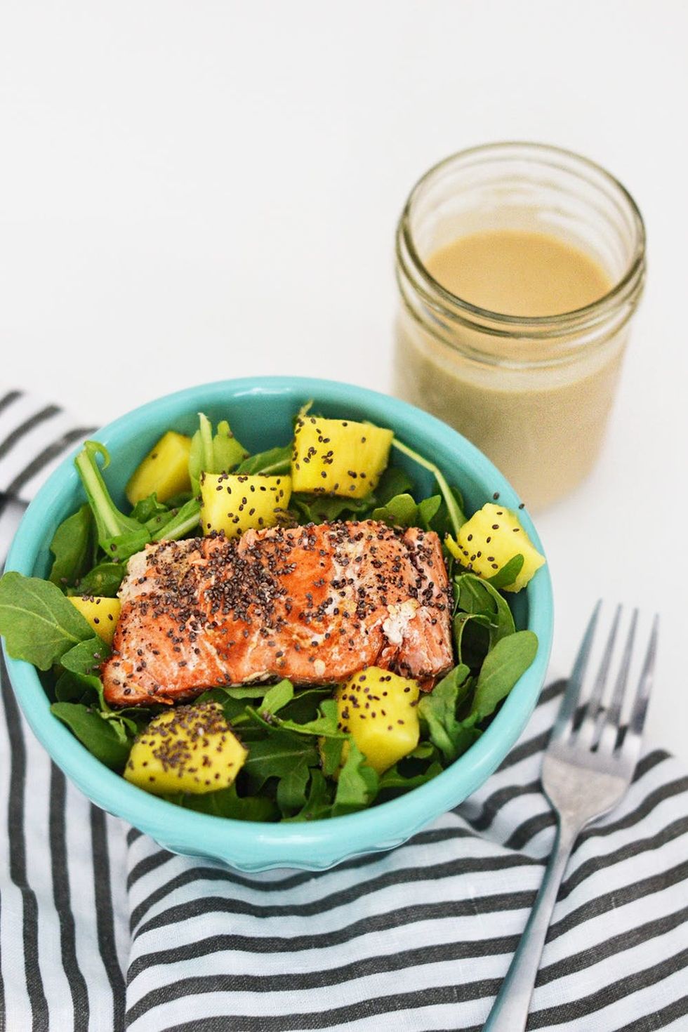 4. Add the arugula into a small bowl, and top with the salmon, mango, and the tahini sauce. Bonus: Add chia seeds for an extra crunch.