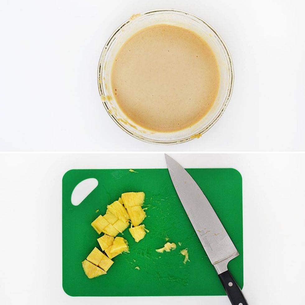 If the mixture begins to clump together, add about 1/4 or 1/2 cup of water into the dressing to loosen it up. Next, slice the mango into cubes and place aside.