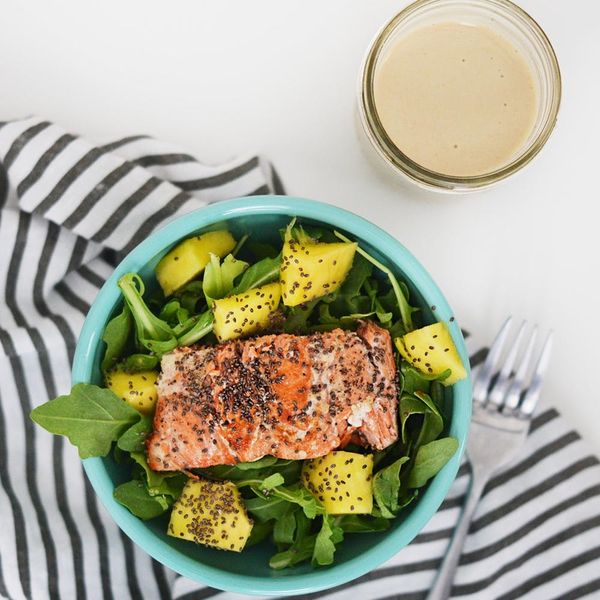 4. Add the arugula into a small bowl, and top with the salmon, mango, and the tahini sauce. Bonus: Add chia seeds for an extra crunch.
