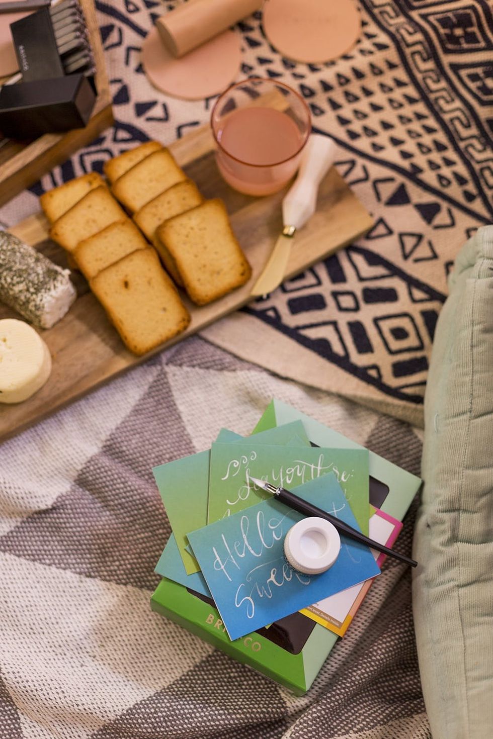 Bar carts are amazing for slumber parties. Fill one up with snacks, drinks, treats, and of course, with Brit + Co DIY Kits! For this slumber party, we loaded up on a Learn to Embroider Kit ($20), a DIY Calligraphy Kit ($20), a Chalk Lettered Wall Art Kit ($20), and a Faux Leather Stamping Kit ($25).