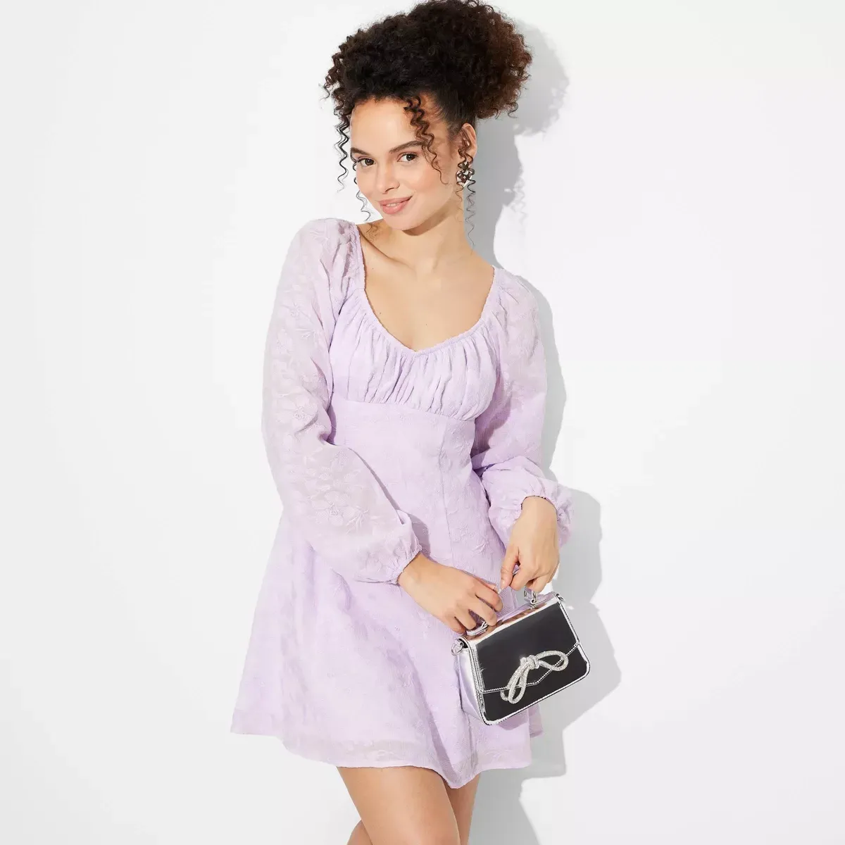 Not a huge fan of pink but want to wear to something that's still feminine? Try a violet mini dress with puffed sleeves. This dress features a floral lace-like fabric that will make you feel like you're living in your own spring rom-com. While it does have an open back, the hidden zipper and back ties will keep you secure as you float around town.
