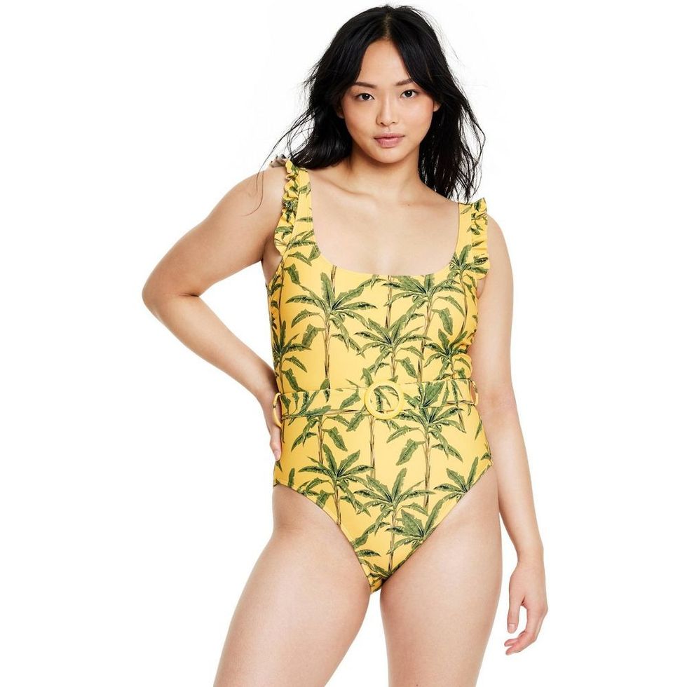 I absolutely love this belted one-piece bathing suit, especially when paired with nude sunglasses, a straw hat, and some gold sandals. The mellow yellow and vertical palm tree print make the perfect statement, without actually saying too much. Plus, the ruffled straps also add a nice little touch.