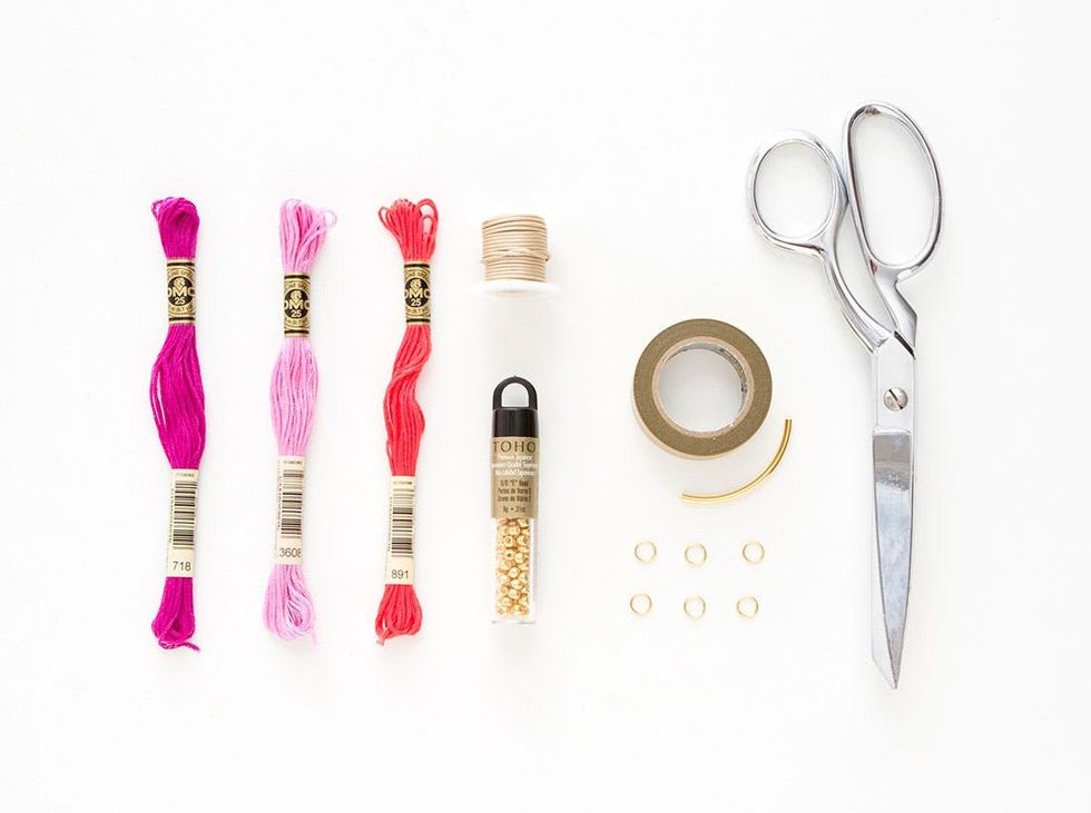 Cut one skein of embroidery thread at both ends, so that it makes two equal bundles. Pull two strands away from each bundle and set aside. You’ll use these to tie your tassels later. Then, tightly wrap one end of each bundle with washi tape, so that they can easily thread through the jump rings.