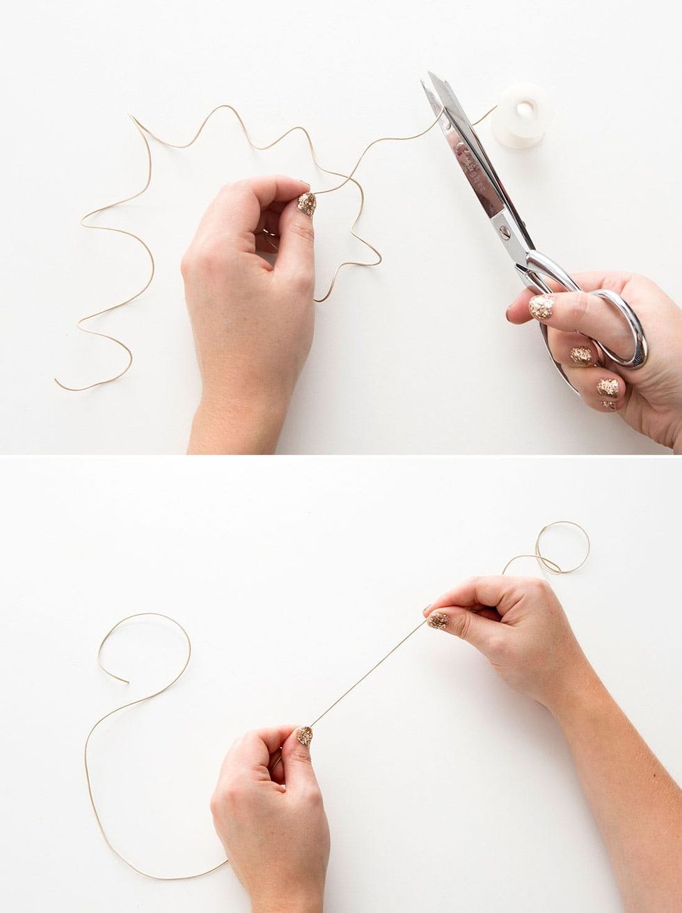 Measure out a long piece of leather cord and cut with scissors. You’ll notice the leather wants to curl up still, so take the time here to stretch and straighten it out.