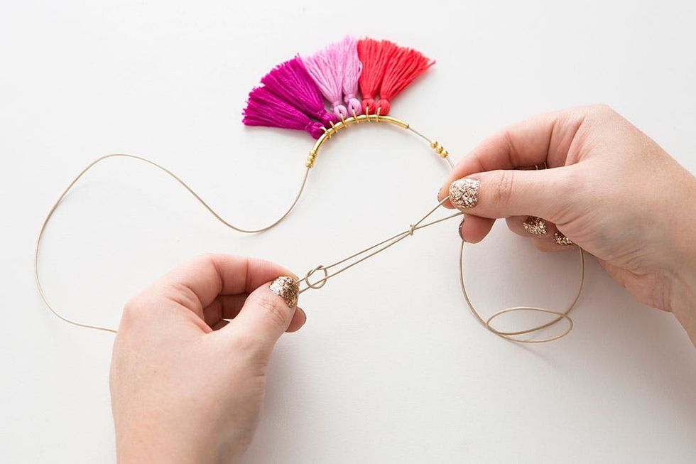 Thread your one gold tube bead and six tassels onto the leather cord, centering the tassels over the tube bead.