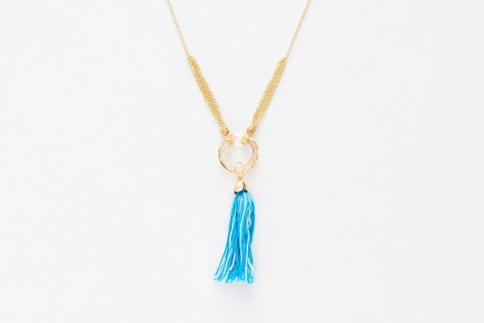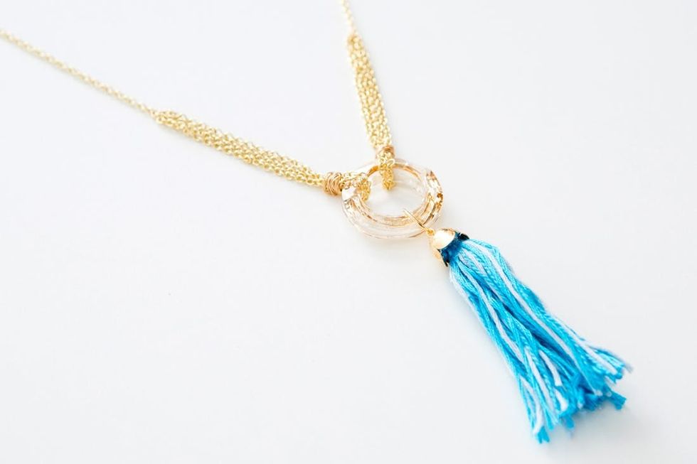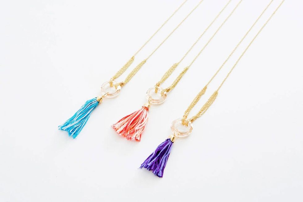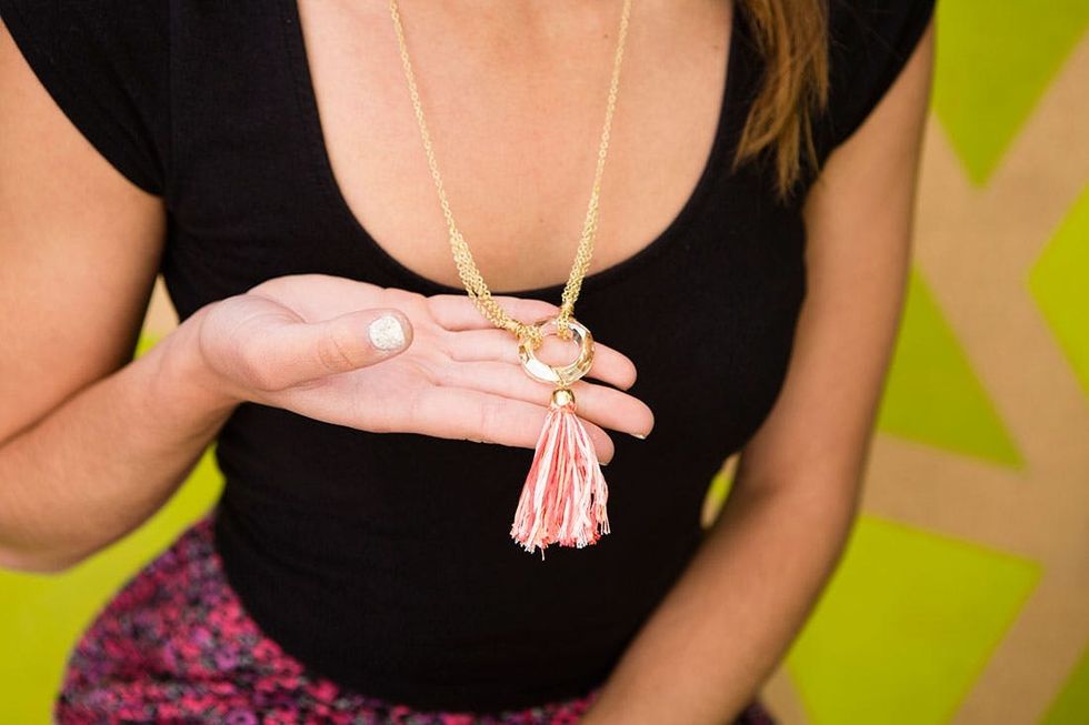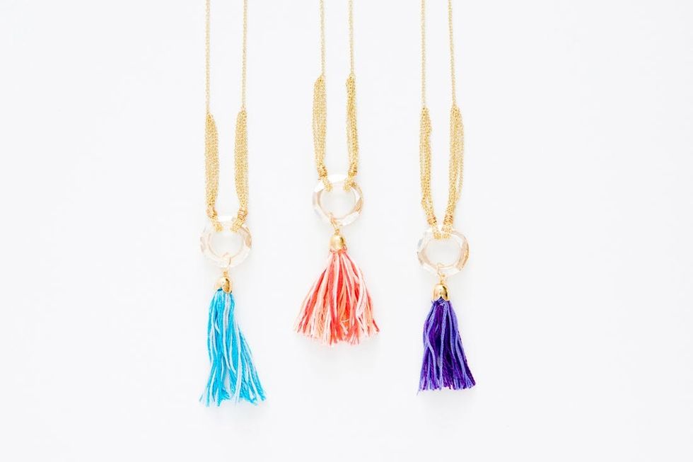 We always have our eyes wide open when it comes to scoping cute outfits around the city. And one thing we’ve recently noticed is that tassels are a total must! So we decided to put a summery twist on the tassel necklace by using bright embroidery floss + thin chain instead of heavier leather. Of course, we couldn’t pass up the additional wow factor of adding a chic acrylic ring to the mix. But just ’cause we’re adding on elements doesn’t mean we’re making it harder — you can make one, two or even three of these tassel necklaces in under 40 minutes. Mid-year gifts for friends just because? We think so!