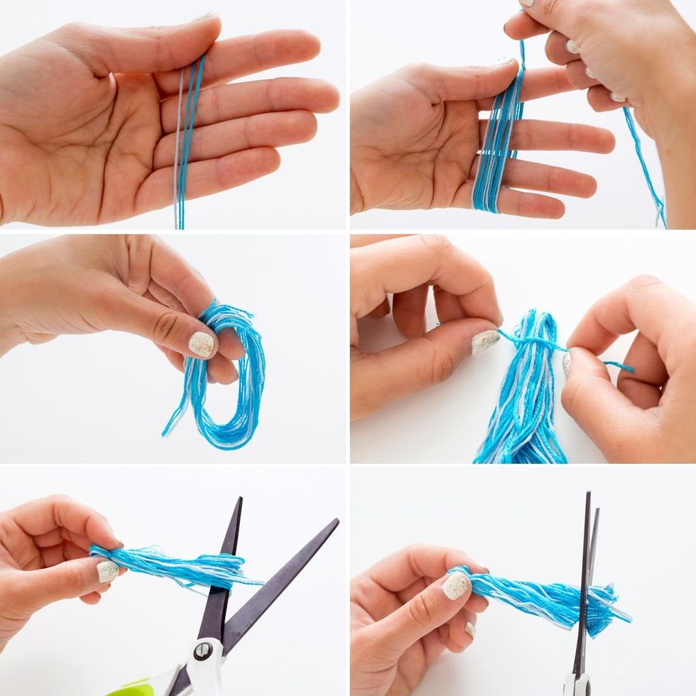 1. Make your tassel: Do this by wrapping the embroidery floss around your hand at least 20 times. Slide the floss off of your hand. Use an extra piece of string to tie a knot at the top and then snip the bottom loop to form individual tassel strings.
