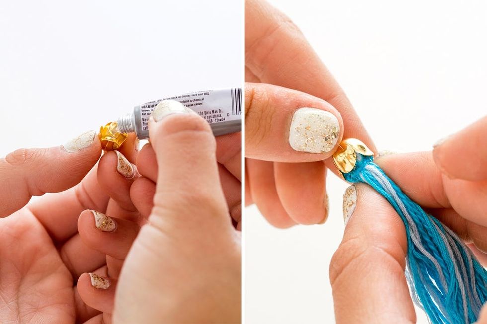2. Add some E6000 to your end cap and stick the knotted end of the tassel inside. Wait for it to dry, 20 to 30 minutes.
