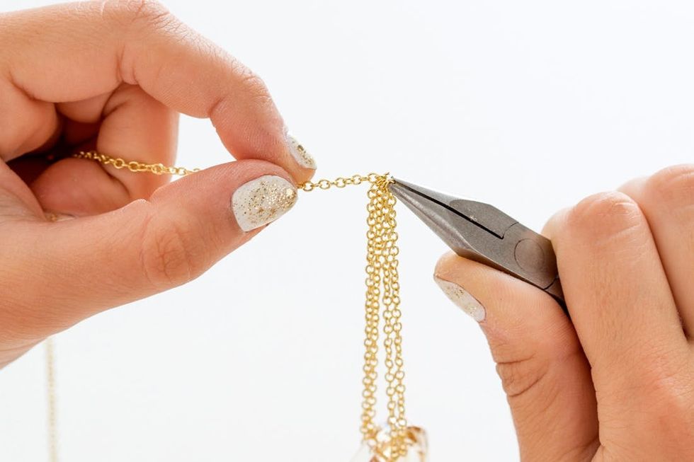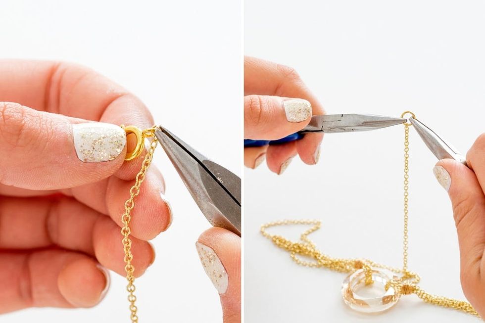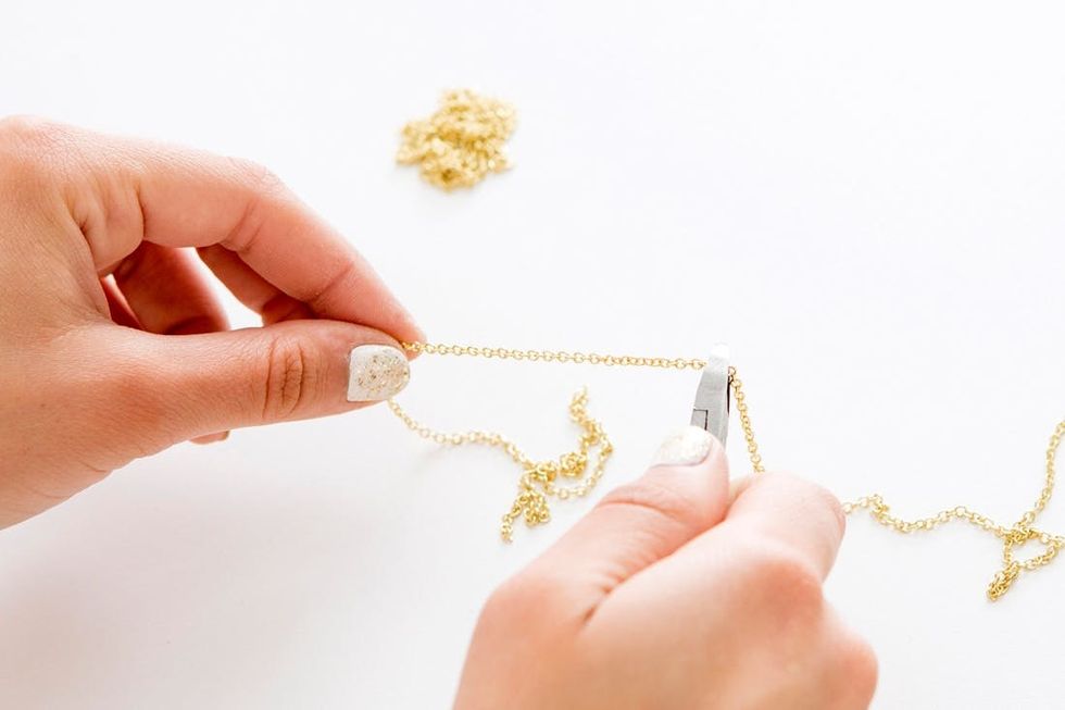 8. Since you attached both ends of the 2 ft chain to the necklace, use the wire cutters to cut the it in half. Then, attach the small sized jump ring and clasp to one end and the medium sized jump ring to the other end.
