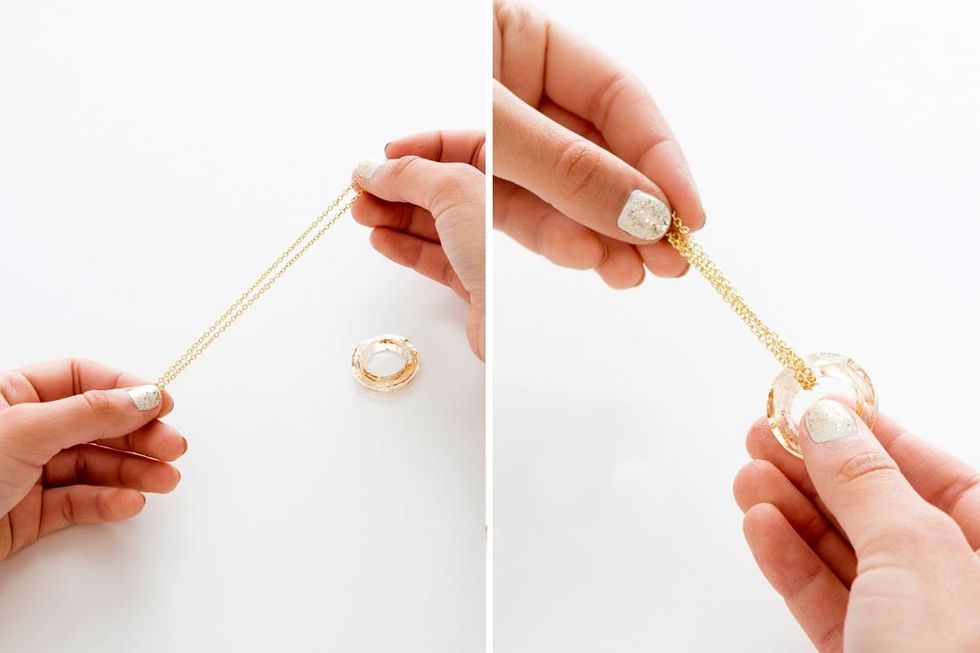 Take one of the 1 ft pieces of chain, fold it in half, then loop it through your decorative ring. We found these cool acrylic rings at our neighborhood bead store. Check out your local jewelry supplies stores to find something similar, or you could always substitute brass rings from the hardware store.