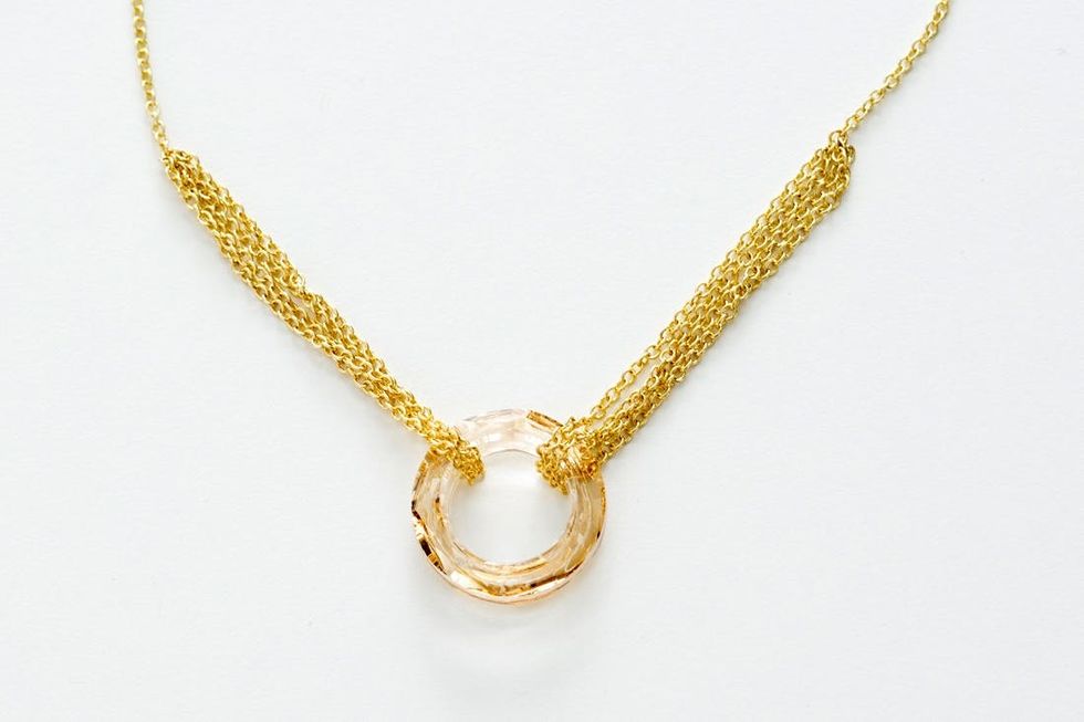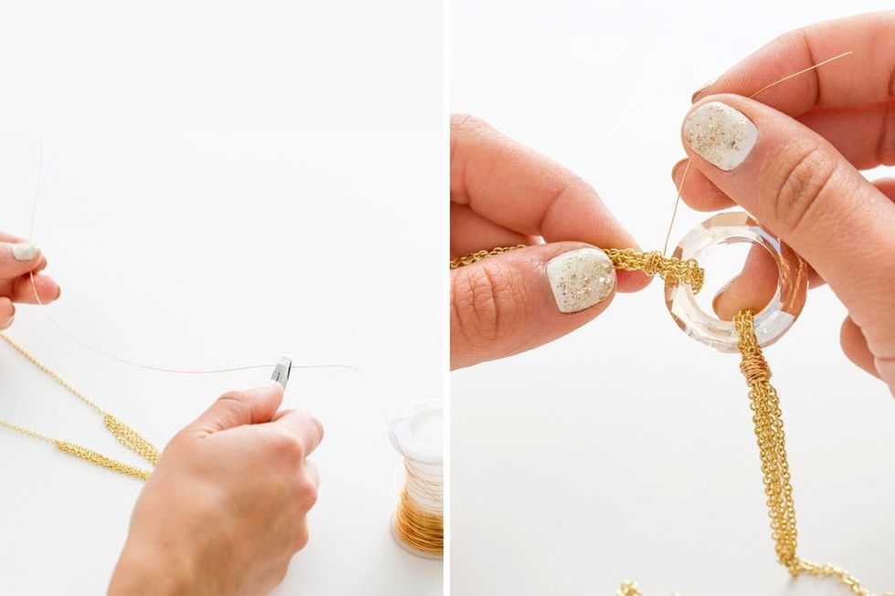Did you notice that gravity takes over and the chains don’t stay together? Well it happens. To avoid this problem, use thin jewelry wire to wrap the chain tight against the decorative ring. Problem solved AND your necklace just got way chicer.