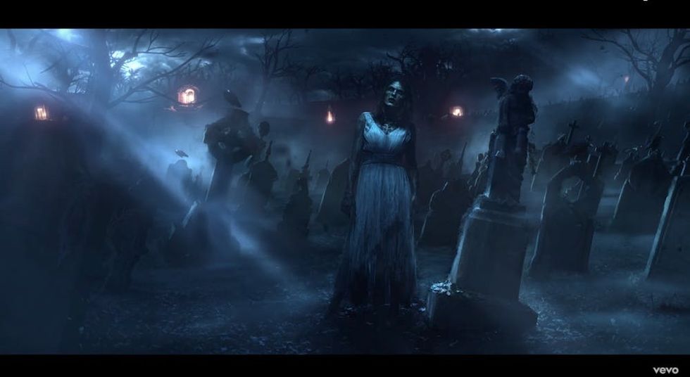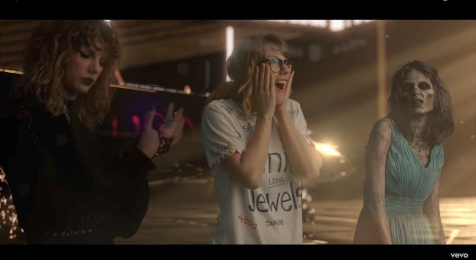 This T.Swift clone — well, a zombie version of her — actually opens the video, rising from the grave of Swift’s reputation before shoveling dirt on another T.Swift clone. She also pops up at the end of the video, where she snaps at “You Belong With Me” Taylor to “stop making that surprised face” and balks at “LWYMMD” Taylor calling her “that b*tch.”
