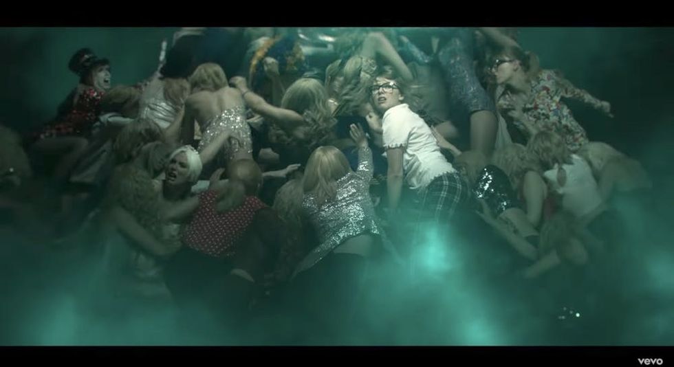 Not all of the T.Swift clones take center stage — there are plenty of others hanging out in the background. Take the 2015 Billboard Awards clone (in the gorgeous, glittery, white bodysuit she wore while attending the event with her ex, Calvin Harris) or the polka-dot shirt and pajama-wearing clones from “We Are Never Ever Getting Back Together.” If you look closely, you can also spot 2014 VMAs Taylor in her baby-blue jumpsuit and 2015 VMAs Taylor in her copper, silver, and gold outfit.