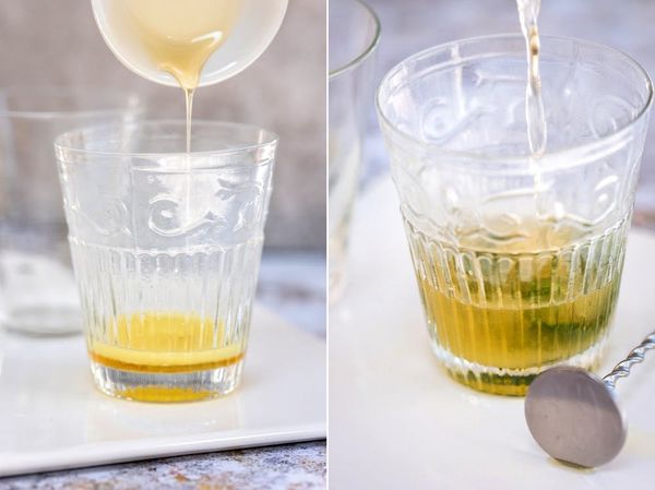 Pour in the agave syrup. Add the mint leaves and gently bruise with a muddling spoon or a clean rolling pin.