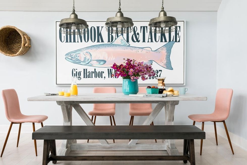 The interior, furnished by Wayfair.com, features a dreamy color scheme of mostly pastel pink, teal, and ivory. We can *totally* see ourselves cozying up with some friends over breakfast in the colorful kitchen, or reading a book by the fire next to our pets in the living room. Swoon.