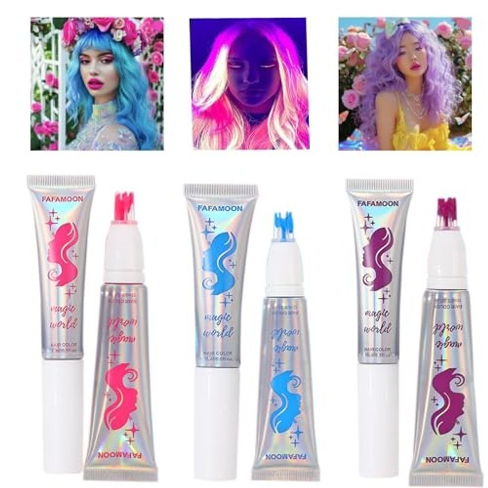 The Dulele three-color neon hair chalk comb is pure Y2K playground energy in stick form. Swipe streaks of pink, blue, or green through your hair for instant mall-rat transformation. It’s bold, non-committal, and perfect for that sleepover-to-concert pipeline.
