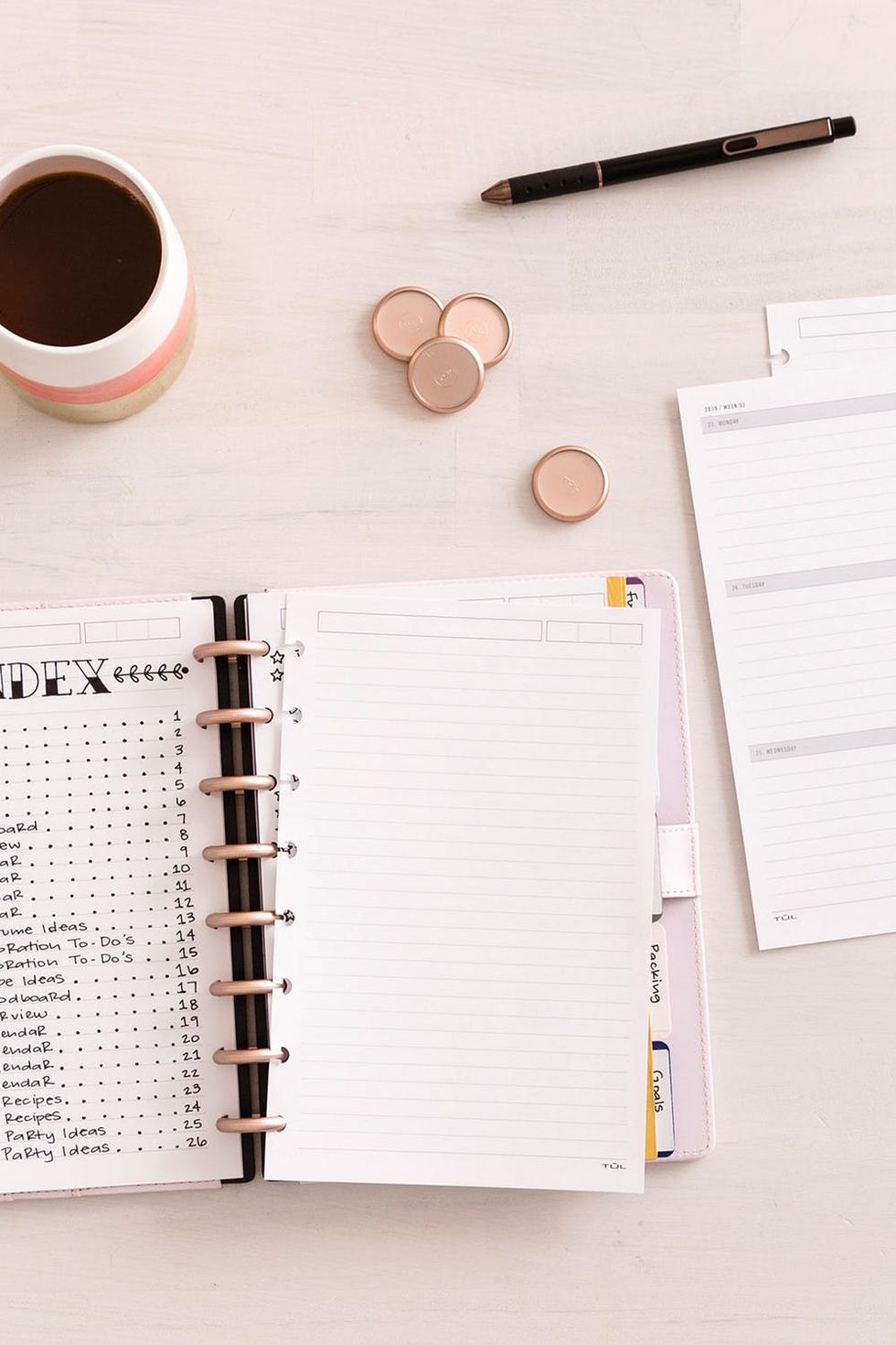 1. Start by finding the ultimate notebook. You’re on the hunt for something in a convenient size — not so tiny that it’s impractical but small enough to throw in your purse for holiday errands. Even more important: You need flexibility, girl! You’re bound to make a few mistakes, last-minute changes, and additions as you get into a groove. Removable and repositionable pages with different formats like a graph, a calendar, and lined paper will make customization easy. The trick is selecting one notebook that will give you all these unlimited options, like our go-to for bullet journaling, the TUL Brilliance Notebook Exclusively for Office Depot® OfficeMax®.