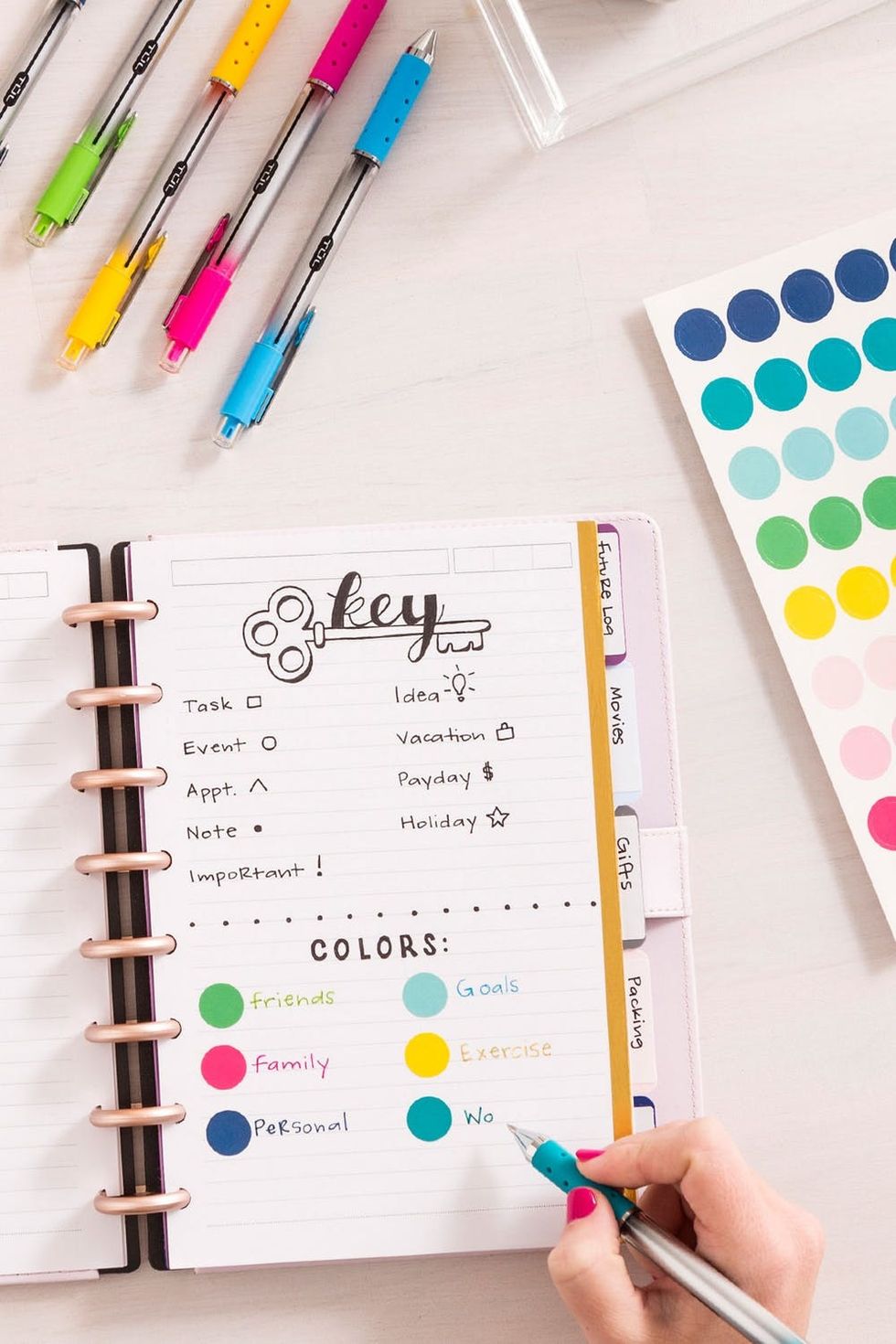 The easiest way to categorize tasks, events, and special days is by color and symbol. Take a look at one of your past to-do lists and note the repeating themes and categories. These are what you will build your journal from!