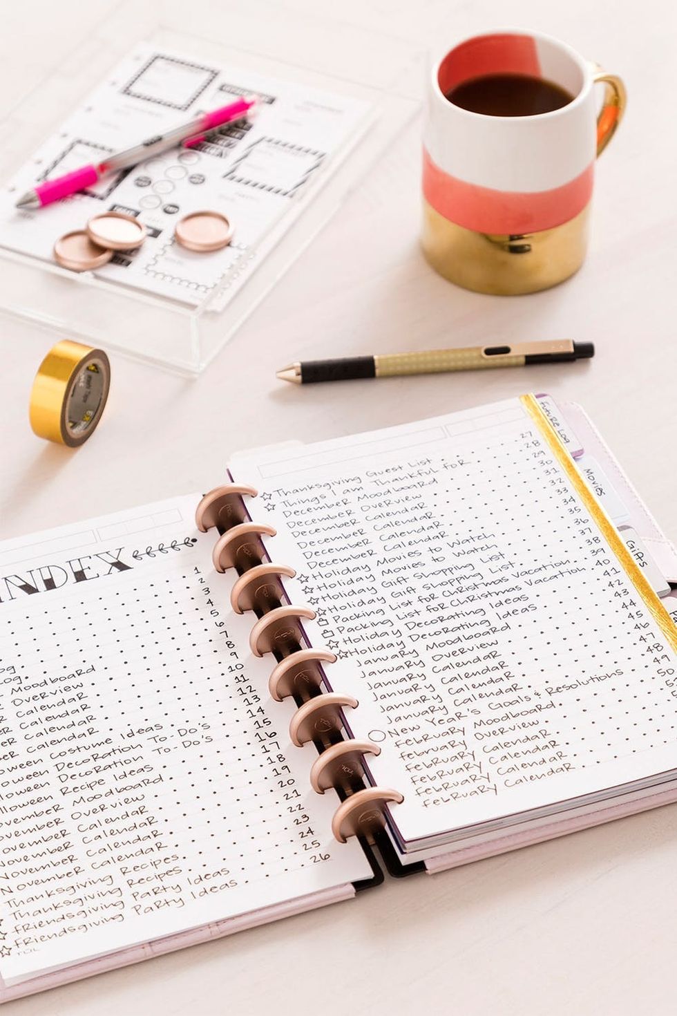2. Create customized symbols, a color key, and an index for easy navigation. Calling all organization addicts! Here’s where your notebook gets personal. There are a million different ways you can customize the structure of your bullet journal, but we like to rely on the basics: a color key, symbols, and an index to keep track of all your pages.