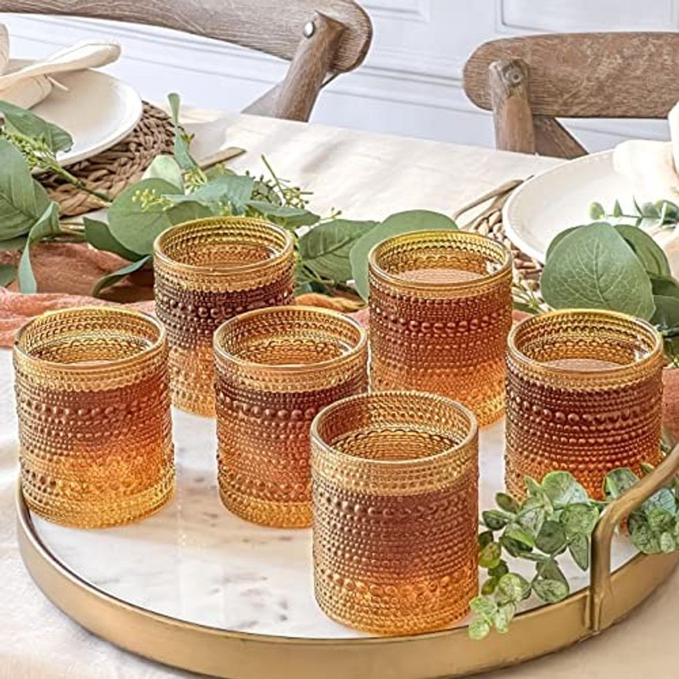 Retro glassware is back in a big way, and these amber ribbed drinking glasses check every box. They catch the light like a sunset and look just as good on open shelves as they do holding sparkling water.