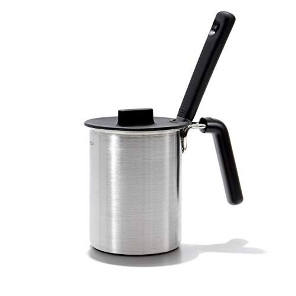 Keep your beloved barbeque sauce safe and sound with this basting pot and brush. The stainless steel pot holds up to 18 ounces of marinade or barbeque sauce and features a silicone lid that will help to avoid spills.