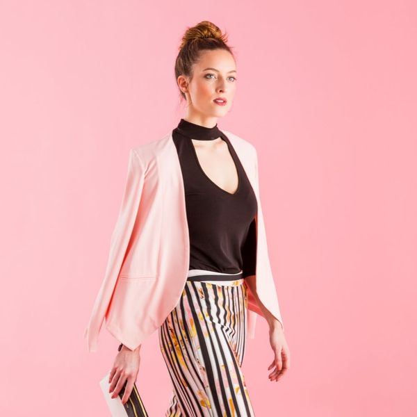 For this look, B+C Brand Analyst Alisa Magennis is channeling her inner boss babe with some serious attitude to get things done in blush, the season’s updated neutral. With her tall hourglass body, she elegantly glides in these wide-legged pants, while the cute blush blazer creates a structured top to keep the whole outfit looking prim and proper.