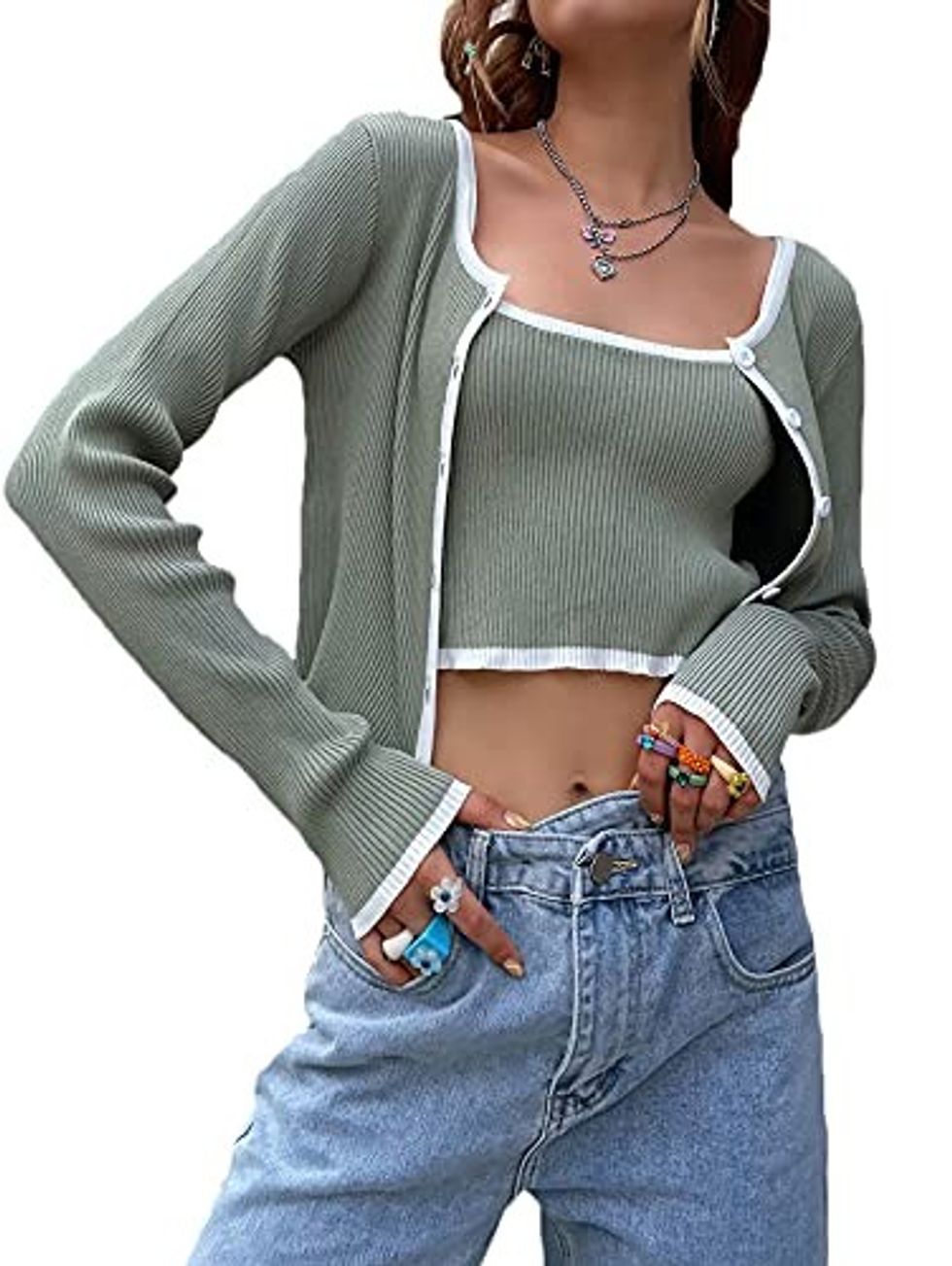 In case you've been living under a rock, Y2K style is back and better than ever. This cami and cardigan set is the sweetest take on early 2000s crop top trends. Pair it with a midi skirt and heels for the most adorable date night look, or wear it with wide leg denim for a truly throwback outfit.