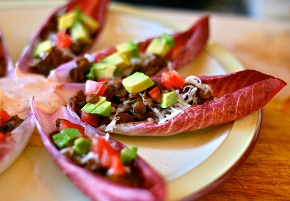 To assemble tacos, spoon lentils into endive leaves and top with tomatoes, avocado, cheese and sour cream.