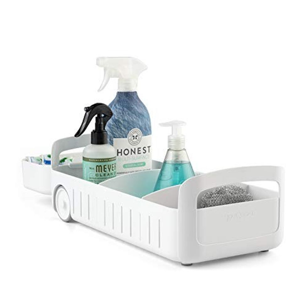 YouCopia's RollOut Caddy is as cute as it is functional; it looks like a car for your cleaning supplies that parks under the sink. Adjustable dividers and a removable hanging basket allow the Rolling Storage Bin to be modified for various needs. Handles make it easy to pick up and carry the Under Sink Organizer where needed.