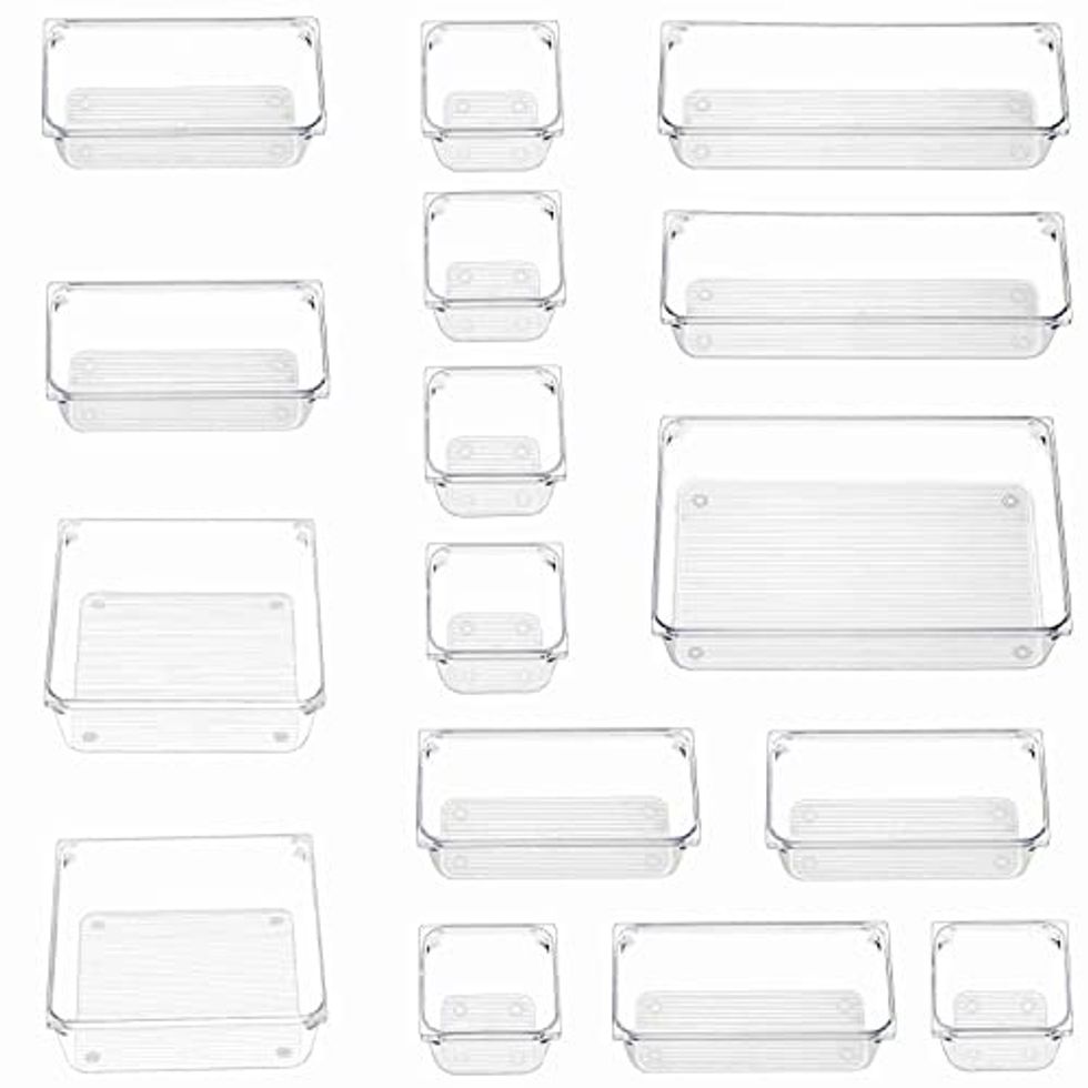 The Clear Drawer Organizers are incredibly versatile and can be used in the bathroom, bedroom, kitchen, or office, and they don't even have to be in a drawer. The Set of 16 Trays includes 5 different sizes. The Trays are also available in a 25-piece set.