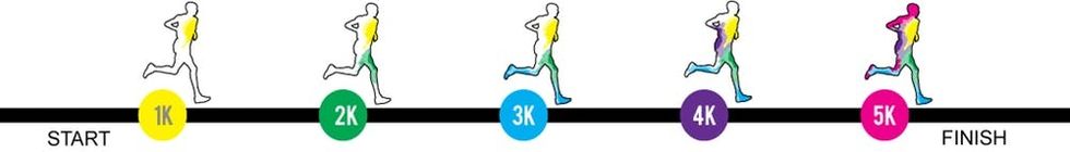 The concept of The Color Run is super simple (and super awesome). Start by wearing all white, as if you are a human canvas. As you run, you will get blitzed with "color dust" so that by the time you hit the finish line you are all color-crazy. Each kilometer is associated with a designated color: 1k is yellow, 2k is blue, 3k is green, 4k is pink, and the 5k finish is a “Color Extravaganza." As the runners/walkers hit the Kilometer COLOR ME RAD™ Zones, they are blitzed by volunteers, sponsors, and staff with COLOR. Hello, photo opp!? Don't forget your cameras, people.