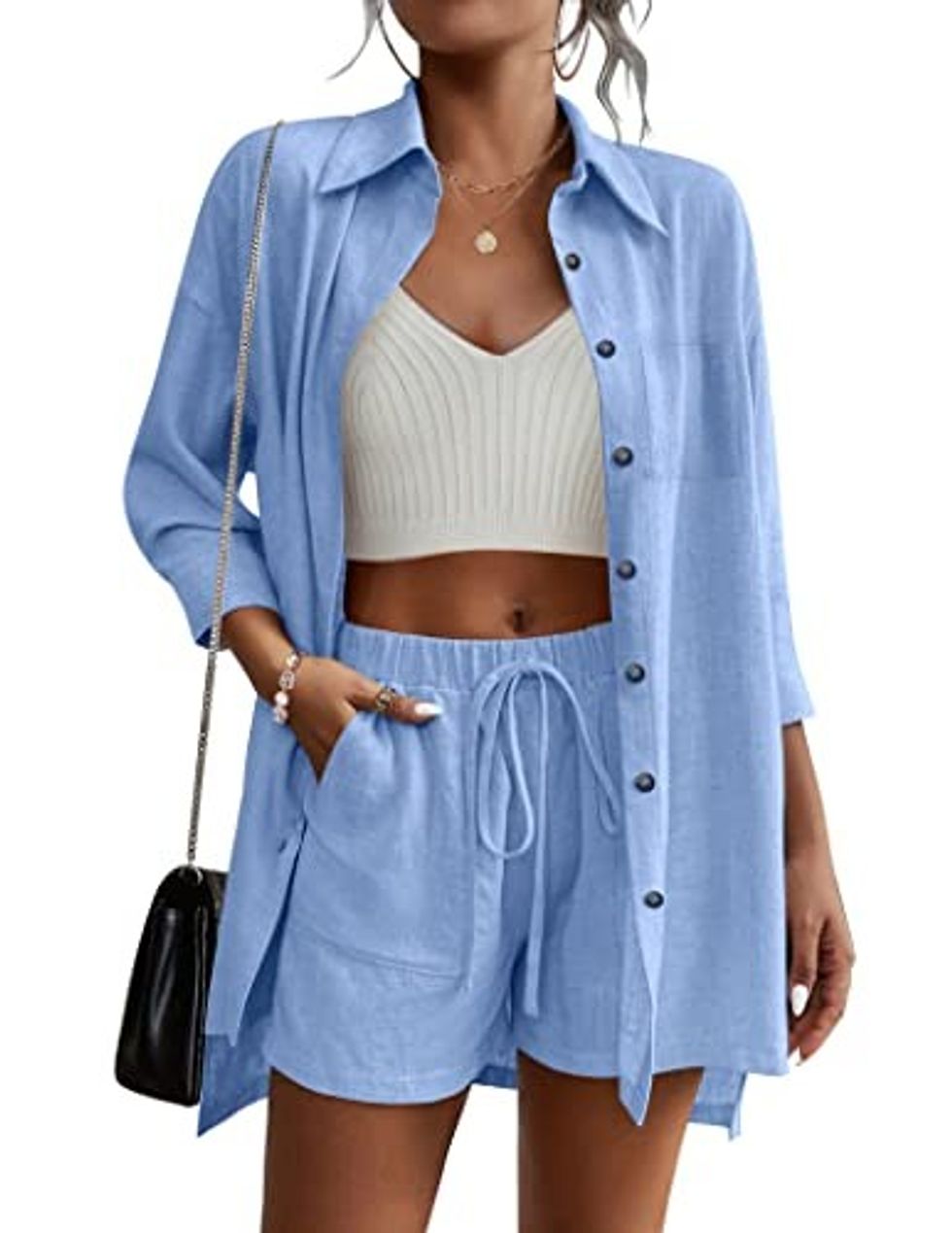 A super comfy linen set to lounge in. Consists of a button down shirt with 3/4 sleeves and high-rise elastic waistband shorts with side pockets! The side pockets especially important as you can venture out bag-free. Ah, the simple holiday joys!