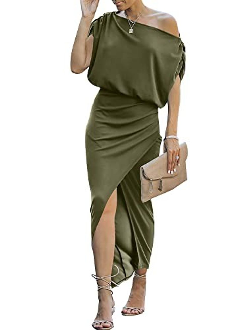 Your evening glam dress that boasts a one shoulder design, wide neckline, elastic waistband and ruched sides. It will define your figure beautifully.