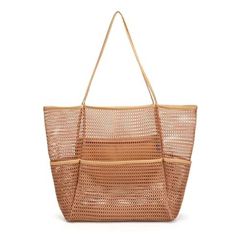 The Mesh beach tote bag that you don't have to worry about getting wet. It's super big so you can carry all that you don't need with ease and it also contains a small zippered compartment on the inside.