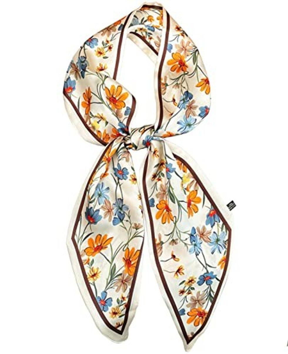 A lovely floral scarf that you can play with. Tie it around your hair on a bad hair day, around your neck as an accent or on your bag as an accessory.