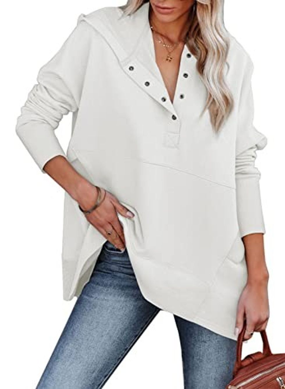 This AlvaQ V Neck Oversized Sweatshirt with Pockets provides comfort and practicality with an easy-wearing oversized fit, button V neck, and pockets.