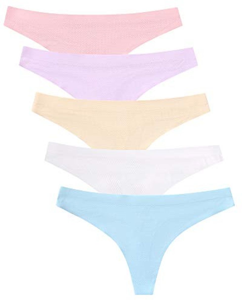 These voenxe Seamless Thongs offer a comfortable and invisible underwear option with their seamless design and no-show thong style. Each pack has five pairs, and they come in various colors and prints.