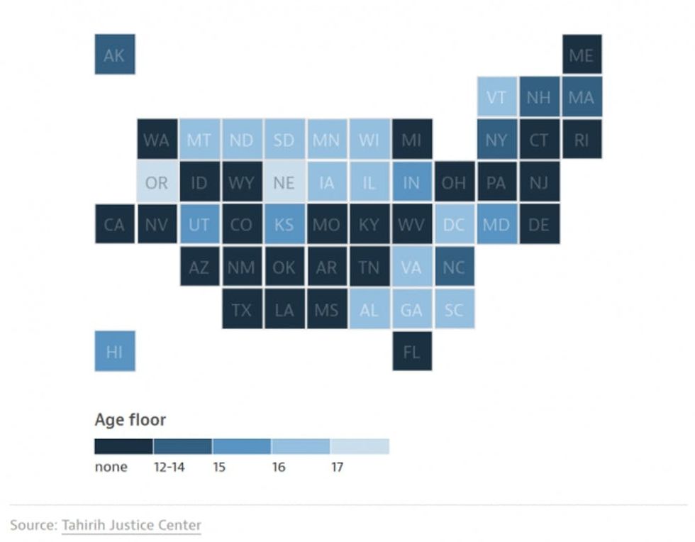 While some of the states with zero requirements for a minimum marriage age fall (perhaps predictably) in the Bible belt, marriage age laws are also lacking in Southwestern, Northeastern, and Midwestern states as well. These states are: Arizona, Arkansas, California, Colorado, Connecticut, Delaware, Florida, Idaho, Kentucky, Louisiana, Maine, Michigan, Mississippi, Missouri, Nevada, New Jersey, New Mexico, Ohio, Oklahoma, Pennsylvania, Rhode Island, Tennessee, Texas, Washington, West Virginia, and Wyoming.