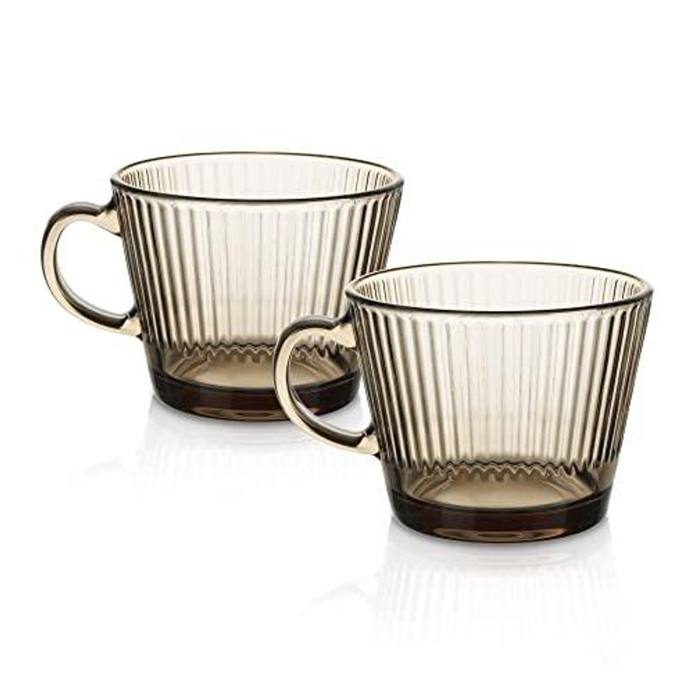 Make your morning coffee extra special with these glass coffee mugs that offer a light amber color and ribbed detail for a vintage look and feel. The teacup design and thickened bottom make these mugs ideal for hot beverages.