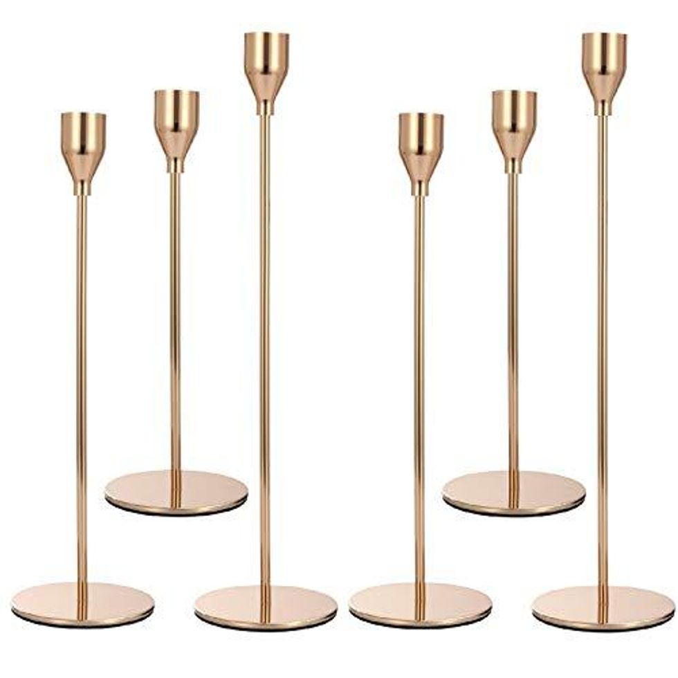 Enhance your tablescape with decorative gold candlesticks. The set of six sticks can be rotated and come in varying sizes that can be used every night for dinner or on special occasions and holidays.