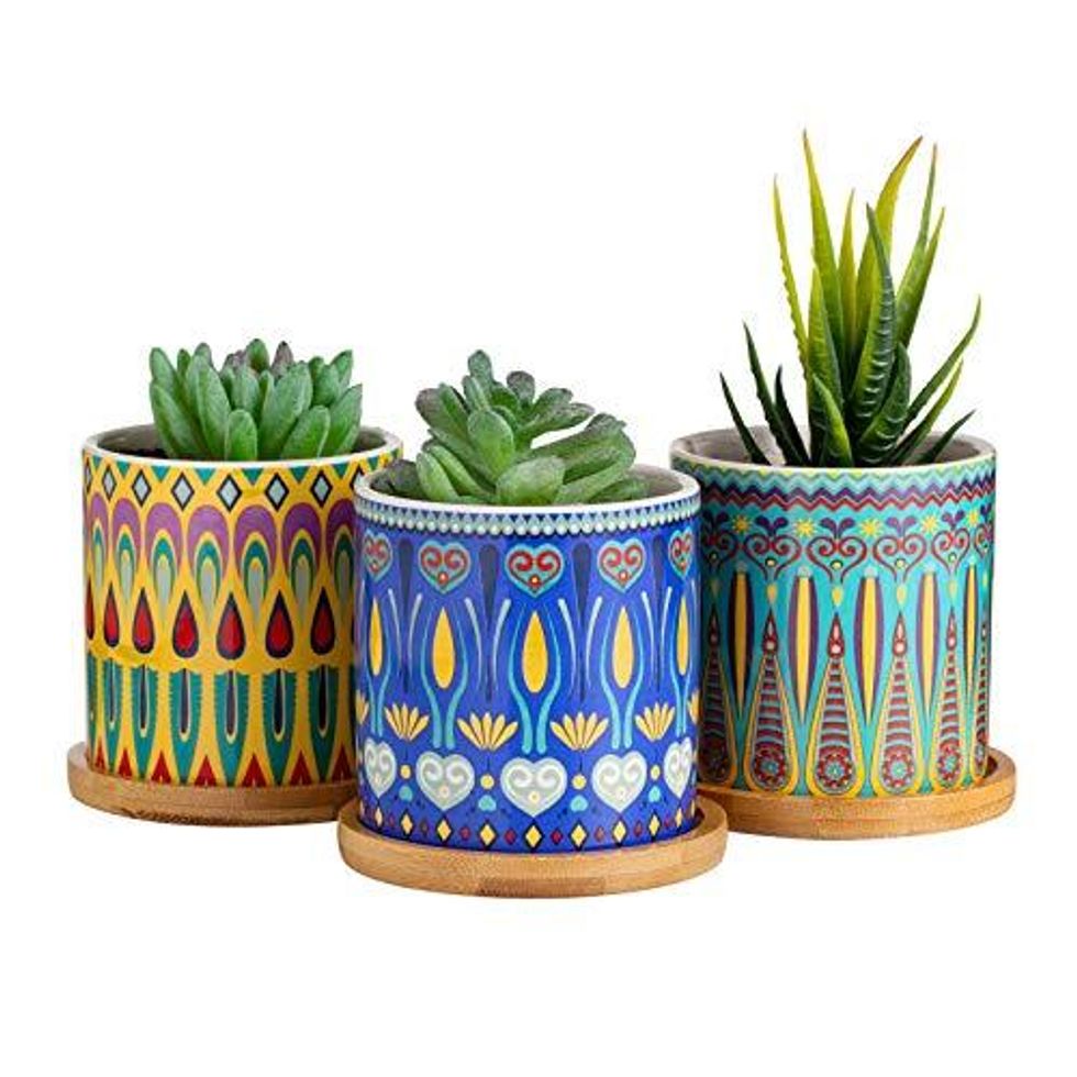 Add a little pizzazz to your tiny succulents with these ceramic plant pots. Display your favorite plants in these colorfully patterned pots that feature a drainage hole and bamboo saucer.