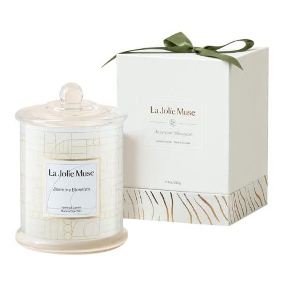 Gift yourself or a loved one this natural soy luxury glass candle. Its jasmine blossom scent is enhanced with a beautiful gold and white jar that can be used after the candle is done burning.