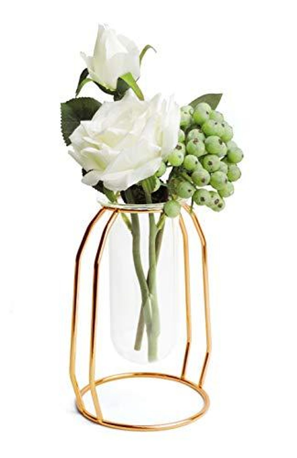 Prop this metal frame vase onto your desk or side table for a tasteful and stylish look. Its hanging glass tube design can fit faux or real flowers and comes in a variety of sizes to fit your needs.