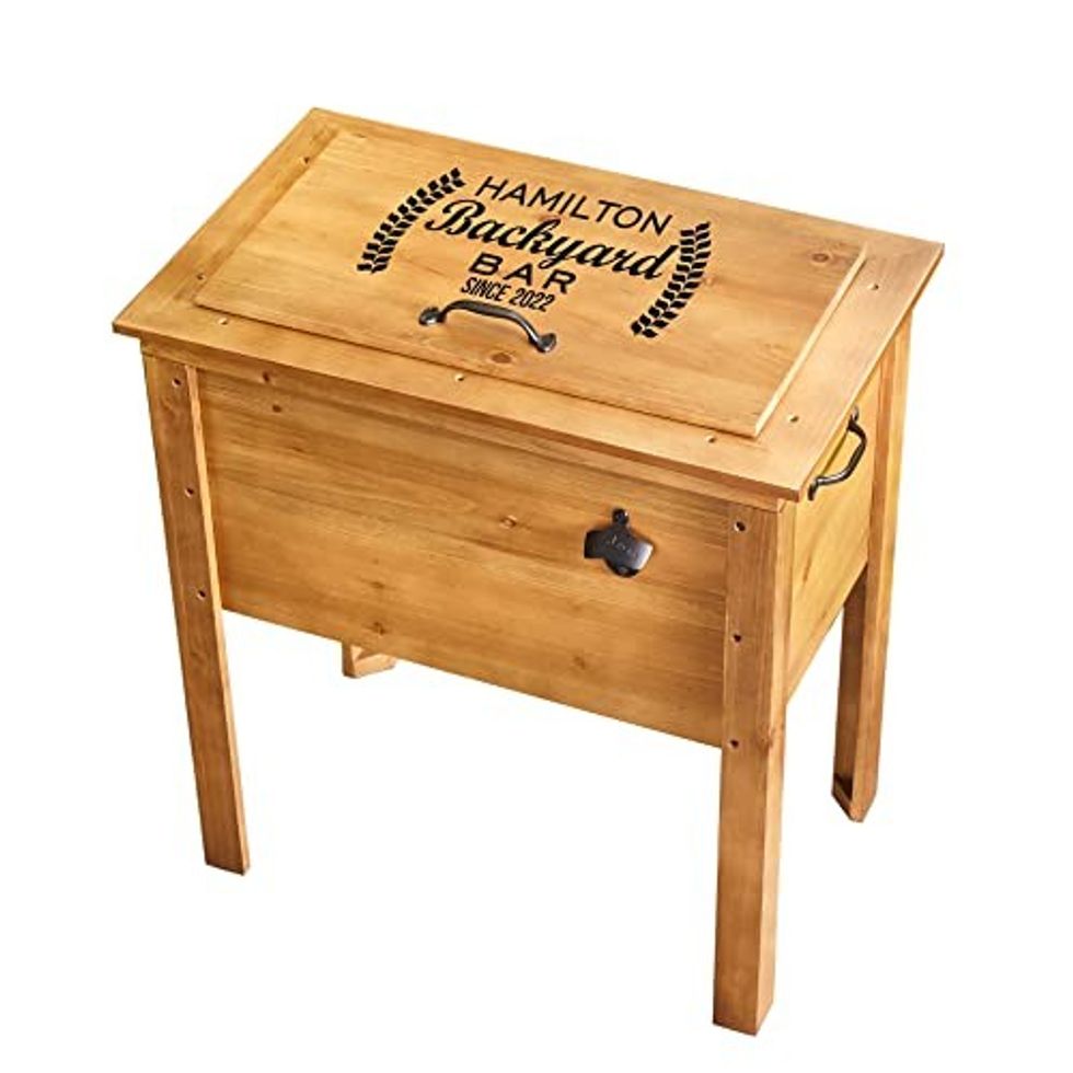 The Outdoor Wooden Cooler can be customized with your name and year. Several designs are available in addition to the Backyard Bar, such as Chillin & Grillin, Daddio of the Patio, and BBQ Crew. The inside of the Fir Wood Cooler is made of galvanized metal with a convenient drain for emptying.