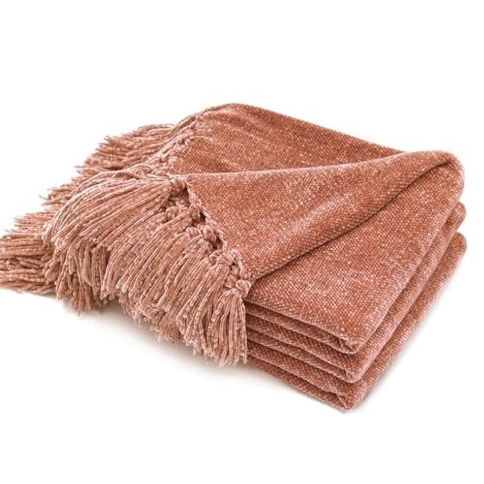 Snuggle under this knit blanket that's made with luxe chenille fabric. This woven blanket is incredibly soft and warm and is available in 20 colors and patterns, including an understated clay and plaid harvest orange.